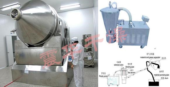 出料方式:筒體向出料方向傾斜20°后,再向出料方向360°旋轉(zhuǎn),錐體部設(shè)螺旋刮板,物料通過(guò)刮板迅速導(dǎo)出。筒體的出料口,裝有材質(zhì)為油尼龍的封閉式出料裝置出料時(shí)在出料裝置上套上布袋至收料桶,可實(shí)現(xiàn)無(wú)粉塵飛揚(yáng)密閉出料。